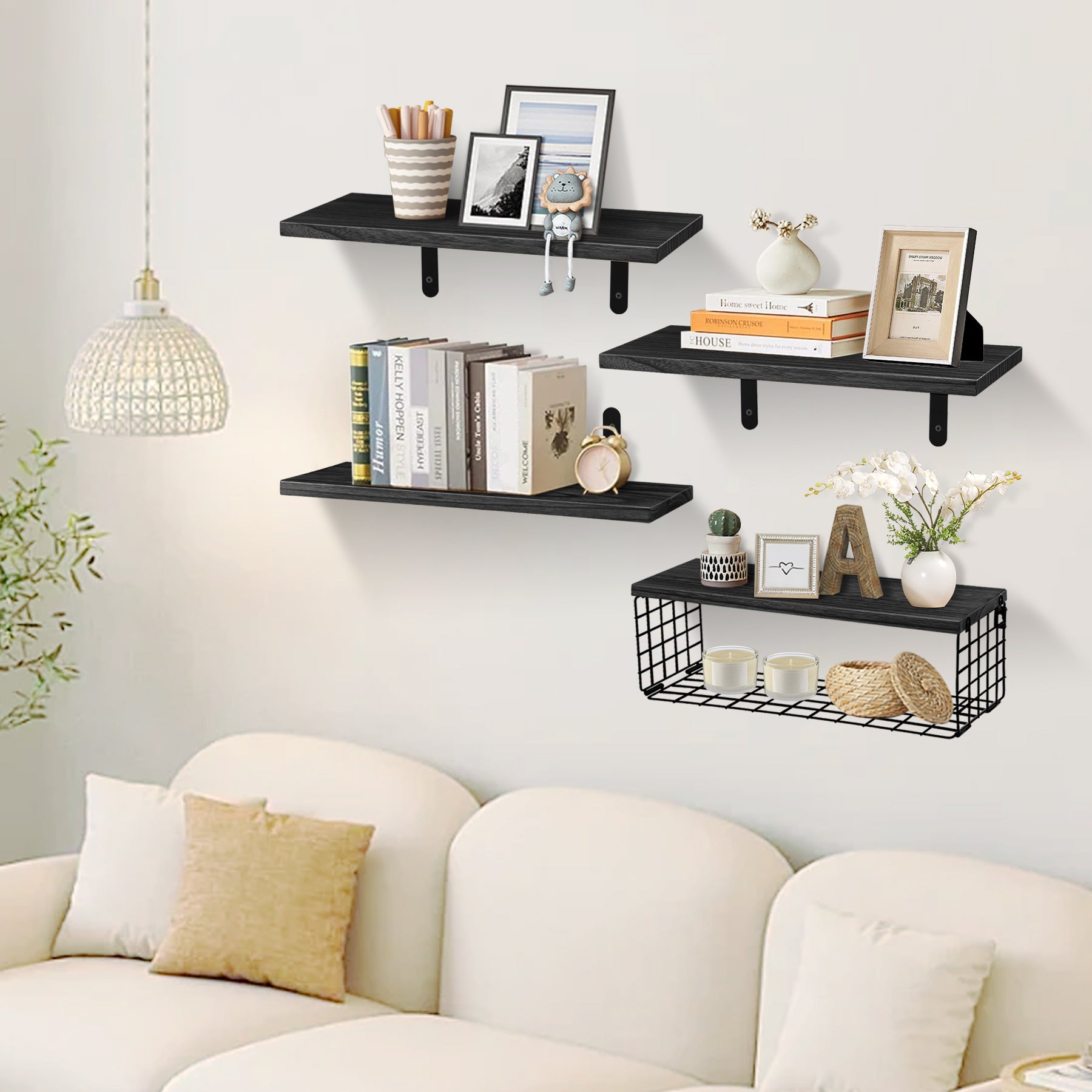 【Easy to Install】Wall mounted shelves package includes an installation guide, 4 floating shelves, 1 metal storage basket, 6 L-shaped metal brackets, and all the necessary hardware. Simply follow the instructions, assembling our floating shelves takes just a few minutes, then transforming your wall into a functional storage space.